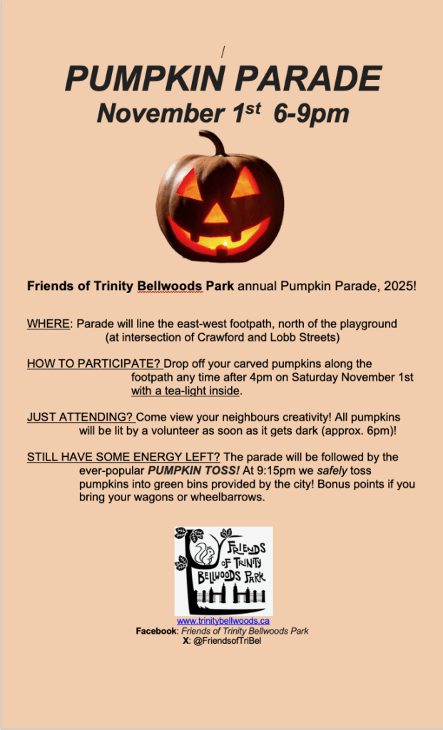 Pumpkin Parade operations needs some help to run this beloved annual event safely and smoothly. Can you give this community event a few hours on Nov.1st? Then email** friends@trinitybellwoods.ca Subject line: PParade volunteering and if we need you we’ll get back to you asap. Note: Teens can get community hours. **newsletter replies are not monitored and will not get a response.